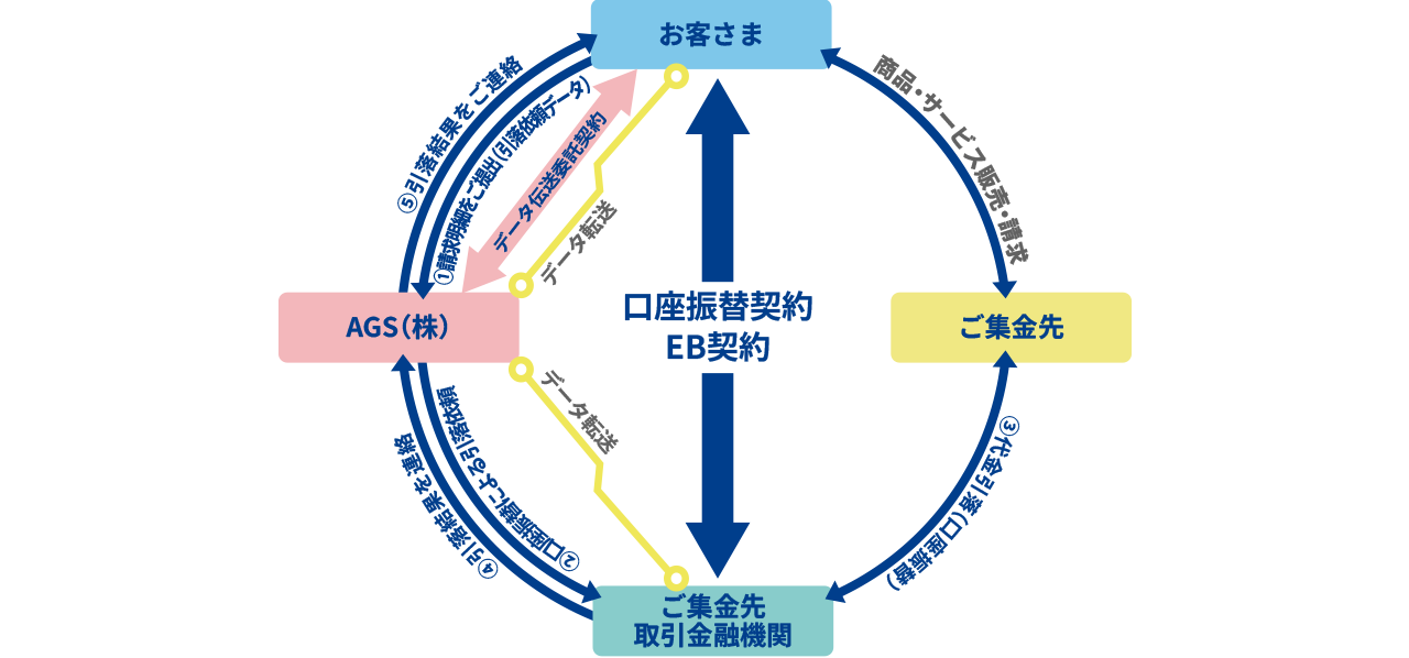 お客さまが作成された請求データをAGSが受領し、各金融機関へ伝送します。