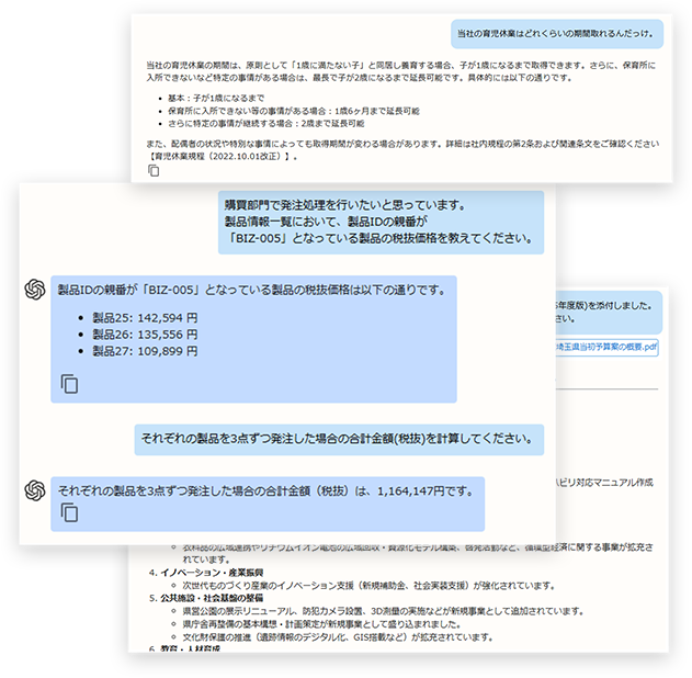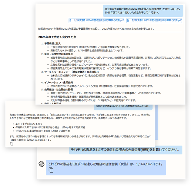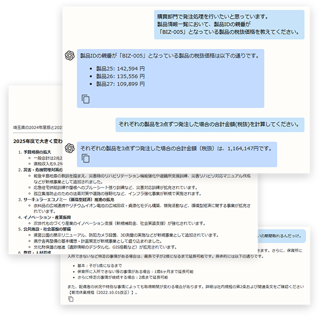 社内のPDFマニュアル、Wordドキュメント、Excelデータなどをセキュアな環境にアップロードするだけで、AIがその内容を参照・検索して回答します。汎用的な回答ではなく、「御社のルール」に即した回答が得られるため、ヘルプデスク業務やマニュアル検索の手間を大幅に削減します。