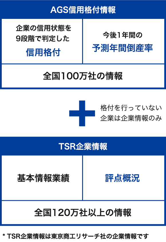 「AGS信用格付情報」と「TSR企業情報」がセットで入手いただける法人会会員様専用のサービスです。