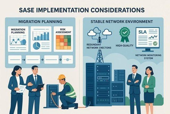 SASE導入を成功させるために事前に検討すべき重要なポイントを解説します。SASEはネットワークインフラの根本的な変革を伴うため、十分な準備なしに導入すると大きなリスクを抱えることになります。適切な計画と準備により、導入時のリスクを最小化し、期待される効果を確実に実現できるでしょう。特に、移行戦略とネットワーク基盤の整備が成功の鍵です。