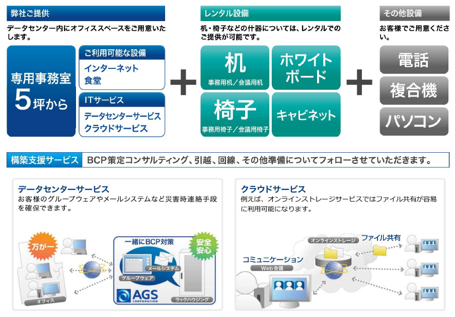 - バックアップオフィスの設置に最適な立地のデータセンター内に構築します。