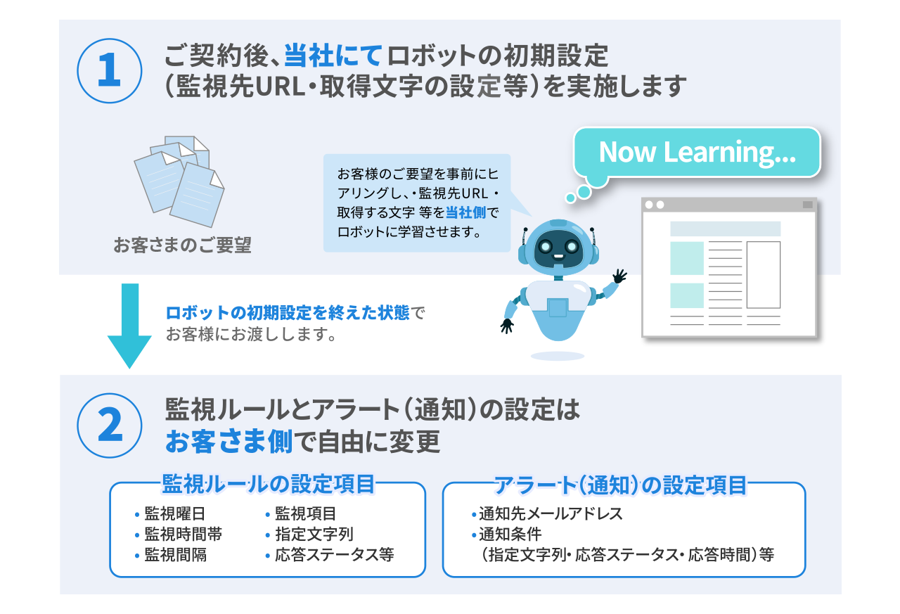 監視ロボットが自動でWeb画面に表示される文言を確認することで、Webサイトの正常性を監視します。