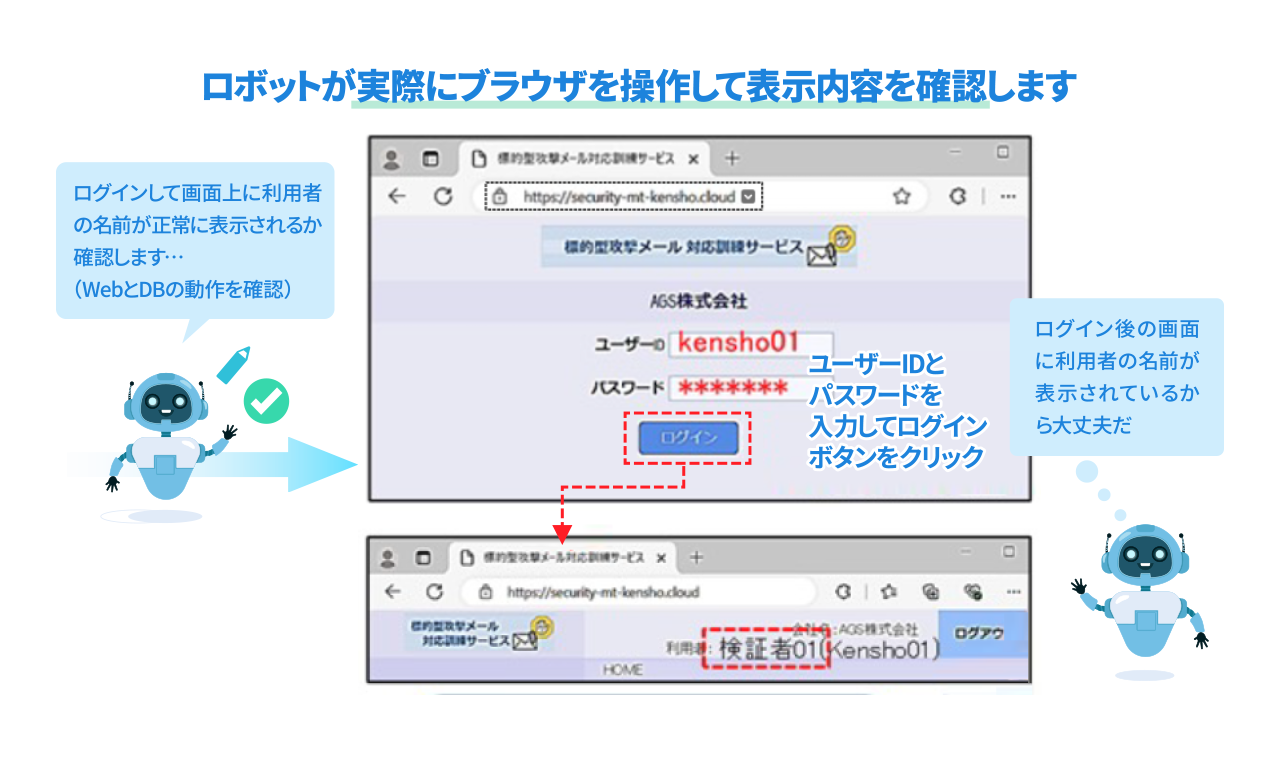 ロボットが実際に操作し、Webサービスやデータベースサービスが正常に稼働しているかの確認を行います。