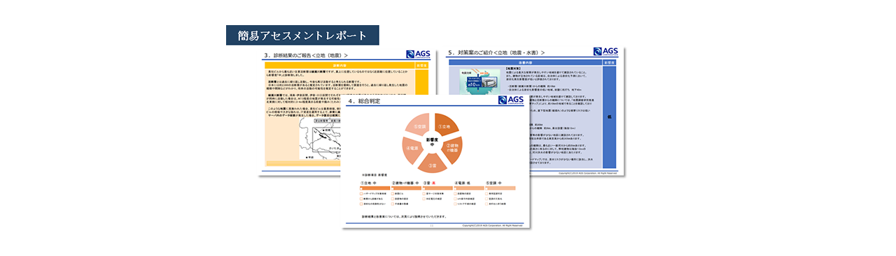 IT資産簡易アセスメントは、AGSが長年のデータセンター運営で培ったノウハウを最大限に活用し、お客さまのIT機器設置状況について、継続稼働に対する安全性診断を行うサービスです。IT資産の設置状況を5つの項目で診断し、お客さまが抱えるリスクを影響度「高・中・低」という指標で可視化します。また、診断結果に応じた対応策を合わせてご紹介しますので、今後の改善にご活用いただけます。