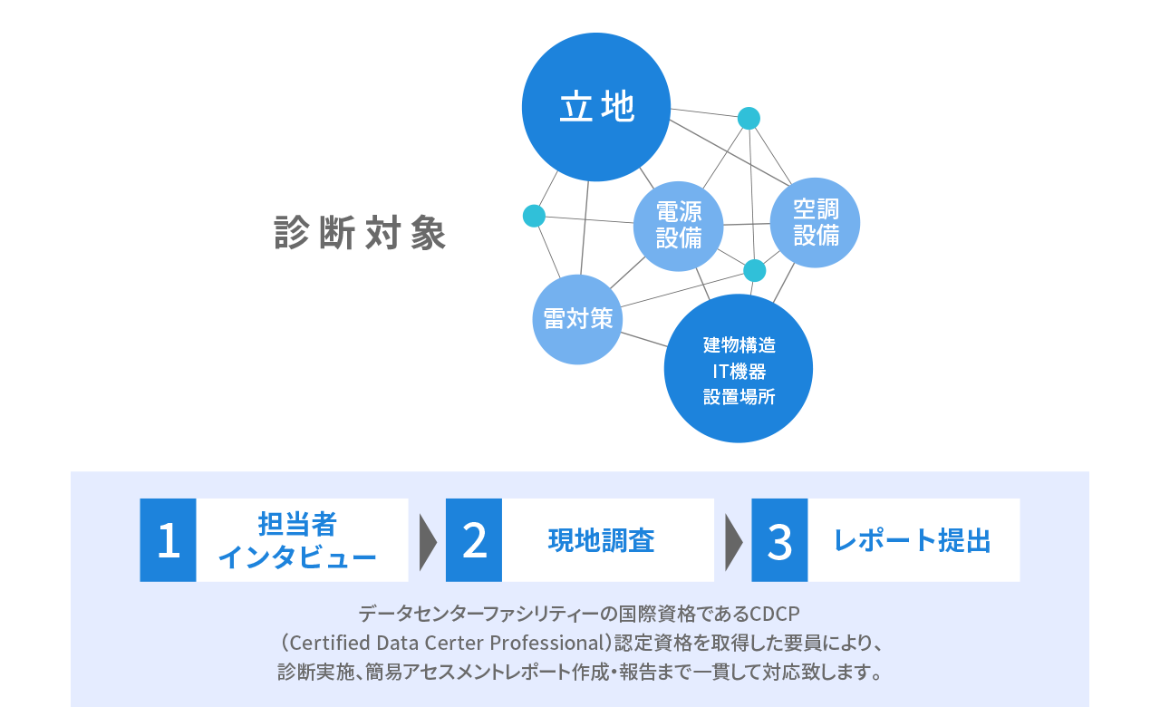 立地、建物構造・IT機器設置場所、雷対策、電源設備、空調設備の5つの項目に対し、詳細な調査を実施します。