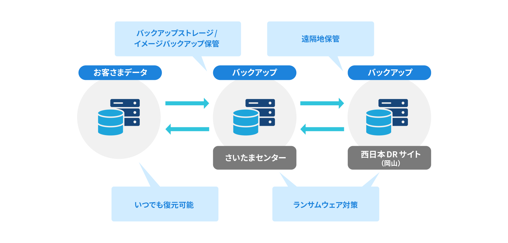当社データセンターのさいたまセンターと西日本DRサイト(岡山)の2か所にデータを保管します。