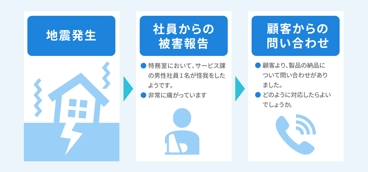 負傷者の発生や設備被害など人的・物的被害への対応に加えて、取引先からの被害報告や顧客からの要求等、実際に起こりうる事業継続に関するシナリオが盛り込まれていますので、事業継続の目的や重要性等をわかりやすく理解できる内容になっております。